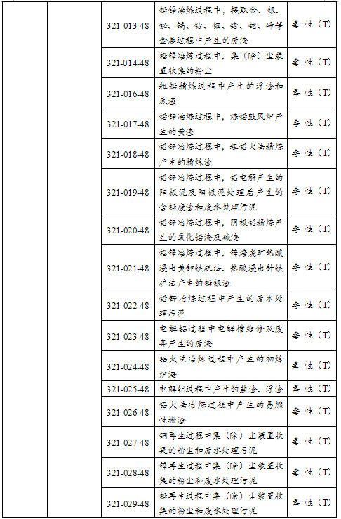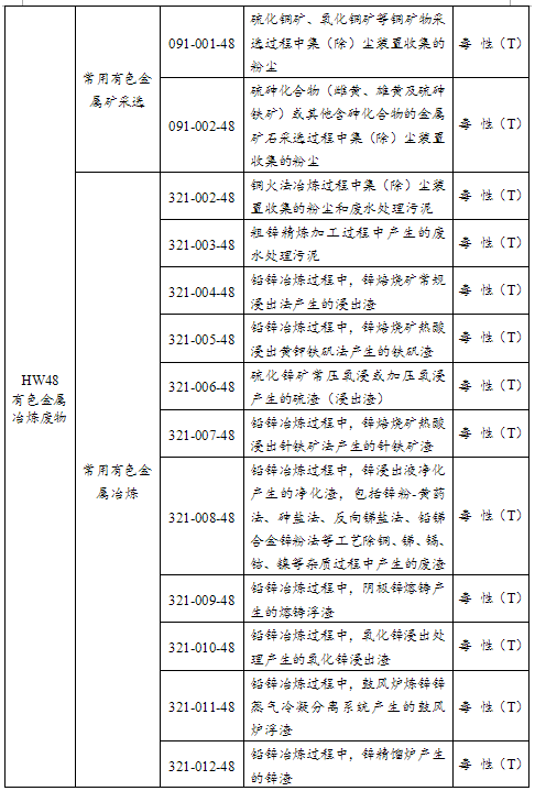 根據(jù)《國家危險(xiǎn)廢物名錄》(2016版),HW48有色金屬冶煉廢物主要來源于常用有色金屬礦采選、常用有色金屬冶煉、稀有稀土金屬冶煉等行業(yè),主要包括硫化銅礦、氧化銅礦等銅礦物采選過程中集(除)塵裝置收集的粉塵;硫砷化合物(雌黃、雄黃及硫砷鐵礦)或其他含砷化合物的金屬礦石采選過程中集(除)塵裝置收集的粉塵;銅火法冶煉過程中集(除)塵裝置收集的粉塵和廢水處理污泥;粗鋅精煉加工過程中產(chǎn)生的廢水處理污泥;仲鎢酸銨生產(chǎn)過程中堿分解產(chǎn)生的堿煮渣(鎢渣);除鉬過程中產(chǎn)生的除鉬渣和廢水處理污泥等。